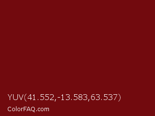 YUV 41.552,-13.583,63.537 Color is a dark red color and the nearest color is Venetian Red #72010f. Hex code #720a0e and RGB value is rgb(114,10,14). In RGB color space, this color is composed of 45% red, 4% green, 5% blue, In CMYK color space, this color is composed of 0% cyan, 91% magenta, 88% yellow , 55% black , In HSL color space, this color has a hue angle of 358° , 84% saturation and 24% lightness.