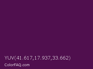 YUV 41.617,17.937,33.662 Color is a very dark magenta color and the nearest color is Clairvoyant #480656. Hex code #500f4e and RGB value is rgb(80,15,78). In RGB color space, this color is composed of 31% red, 6% green, 31% blue, In CMYK color space, this color is composed of 0% cyan, 81% magenta, 3% yellow , 69% black , In HSL color space, this color has a hue angle of 302° , 68% saturation and 19% lightness.