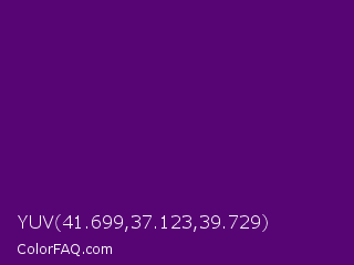 YUV 41.699,37.123,39.729 Color is a dark purple color and the nearest color is Pigment Indigo #4b0082. Hex code #570475 and RGB value is rgb(87,4,117). In RGB color space, this color is composed of 34% red, 2% green, 46% blue, In CMYK color space, this color is composed of 26% cyan, 97% magenta, 0% yellow , 54% black , In HSL color space, this color has a hue angle of 284° , 93% saturation and 24% lightness.