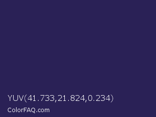 YUV 41.733,21.824,0.234 Color is a dark indigo color and the nearest color is Port Gore #251f4f. Hex code #2a2156 and RGB value is rgb(42,33,86). In RGB color space, this color is composed of 16% red, 13% green, 34% blue, In CMYK color space, this color is composed of 51% cyan, 62% magenta, 0% yellow , 66% black , In HSL color space, this color has a hue angle of 250° , 45% saturation and 23% lightness.