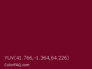 YUV 41.766,-1.364,64.226 Color is a dark rose color and the nearest color is Black Rose #67032d. Hex code #730527 and RGB value is rgb(115,5,39). In RGB color space, this color is composed of 45% red, 2% green, 15% blue, In CMYK color space, this color is composed of 0% cyan, 96% magenta, 66% yellow , 55% black , In HSL color space, this color has a hue angle of 341° , 92% saturation and 24% lightness.
