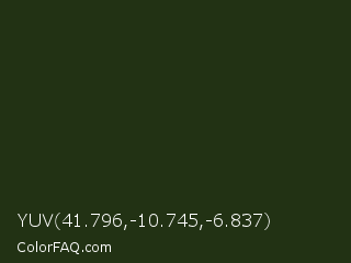 YUV 41.796,-10.745,-6.837 Color is a very dark green color and the nearest color is Mallard #233418. Hex code #223214 and RGB value is rgb(34,50,20). In RGB color space, this color is composed of 13% red, 20% green, 8% blue, In CMYK color space, this color is composed of 32% cyan, 0% magenta, 60% yellow , 80% black , In HSL color space, this color has a hue angle of 92° , 43% saturation and 14% lightness.