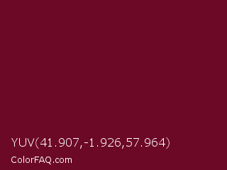 YUV 41.907,-1.926,57.964 Color is a dark rose color and the nearest color is Black Rose #67032d. Hex code #6c0926 and RGB value is rgb(108,9,38). In RGB color space, this color is composed of 42% red, 4% green, 15% blue, In CMYK color space, this color is composed of 0% cyan, 92% magenta, 65% yellow , 58% black , In HSL color space, this color has a hue angle of 342° , 85% saturation and 23% lightness.