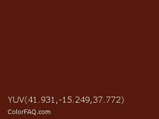 YUV 41.931,-15.249,37.772 Color is a very dark red color and the nearest color is French Puce #4e1609. Hex code #551a0b and RGB value is rgb(85,26,11). In RGB color space, this color is composed of 33% red, 10% green, 4% blue, In CMYK color space, this color is composed of 0% cyan, 69% magenta, 87% yellow , 67% black , In HSL color space, this color has a hue angle of 12° , 77% saturation and 19% lightness.