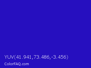 YUV 41.941,73.486,-3.456 Color is a normal indigo color and the nearest color is Interdimensional Blue #360ccc. Hex code #260fbf and RGB value is rgb(38,15,191). In RGB color space, this color is composed of 15% red, 6% green, 75% blue, In CMYK color space, this color is composed of 80% cyan, 92% magenta, 0% yellow , 25% black , In HSL color space, this color has a hue angle of 248° , 85% saturation and 40% lightness.