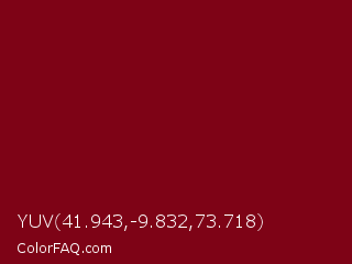YUV 41.943,-9.832,73.718 Color is a dark red color and the nearest color is Red Devil #860111. Hex code #7e0316 and RGB value is rgb(126,3,22). In RGB color space, this color is composed of 49% red, 1% green, 9% blue, In CMYK color space, this color is composed of 0% cyan, 98% magenta, 83% yellow , 51% black , In HSL color space, this color has a hue angle of 351° , 95% saturation and 25% lightness.
