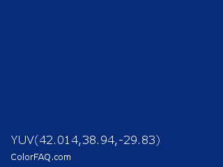 YUV 42.014,38.94,-29.83 Color is a dark blue color and the nearest color is Catalina Blue #062a78. Hex code #082c79 and RGB value is rgb(8,44,121). In RGB color space, this color is composed of 3% red, 17% green, 47% blue, In CMYK color space, this color is composed of 93% cyan, 64% magenta, 0% yellow , 53% black , In HSL color space, this color has a hue angle of 221° , 88% saturation and 25% lightness.