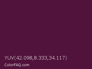 YUV 42.098,8.333,34.117 Color is a very dark magenta color and the nearest color is Wine Berry #591d35. Hex code #51133b and RGB value is rgb(81,19,59). In RGB color space, this color is composed of 32% red, 7% green, 23% blue, In CMYK color space, this color is composed of 0% cyan, 77% magenta, 27% yellow , 68% black , In HSL color space, this color has a hue angle of 321° , 62% saturation and 20% lightness.