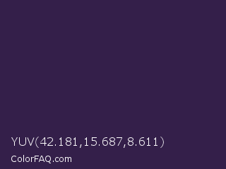 YUV 42.181,15.687,8.611 Color is a very dark violet color and the nearest color is Russian Violet #32174d. Hex code #341f4a and RGB value is rgb(52,31,74). In RGB color space, this color is composed of 20% red, 12% green, 29% blue, In CMYK color space, this color is composed of 30% cyan, 58% magenta, 0% yellow , 71% black , In HSL color space, this color has a hue angle of 269° , 41% saturation and 21% lightness.