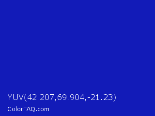YUV 42.207,69.904,-21.23 Color is a normal blue color and the nearest color is Blue Pantone #0018a8. Hex code #121bb8 and RGB value is rgb(18,27,184). In RGB color space, this color is composed of 7% red, 11% green, 72% blue, In CMYK color space, this color is composed of 90% cyan, 85% magenta, 0% yellow , 28% black , In HSL color space, this color has a hue angle of 237° , 82% saturation and 40% lightness.