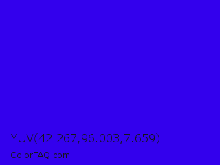 YUV 42.267,96.003,7.659 Color is a normal indigo color and the nearest color is Electric Ultramarine #3f00ff. Hex code #3300ed and RGB value is rgb(51,-0,237). In RGB color space, this color is composed of 20% red, 0% green, 93% blue, In CMYK color space, this color is composed of 78% cyan, 100% magenta, 0% yellow , 7% black , In HSL color space, this color has a hue angle of 253° , 100% saturation and 46% lightness.