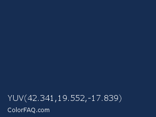 YUV 42.341,19.552,-17.839 Color is a very dark blue color and the nearest color is Space Cadet #1d2951. Hex code #162d52 and RGB value is rgb(22,45,82). In RGB color space, this color is composed of 9% red, 18% green, 32% blue, In CMYK color space, this color is composed of 73% cyan, 45% magenta, 0% yellow , 68% black , In HSL color space, this color has a hue angle of 217° , 58% saturation and 20% lightness.