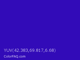YUV 42.383,69.817,6.68 Color is a normal indigo color and the nearest color is Interdimensional Blue #360ccc. Hex code #320bb8 and RGB value is rgb(50,11,184). In RGB color space, this color is composed of 20% red, 4% green, 72% blue, In CMYK color space, this color is composed of 73% cyan, 94% magenta, 0% yellow , 28% black , In HSL color space, this color has a hue angle of 254° , 89% saturation and 38% lightness.