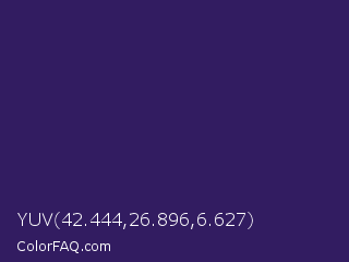 YUV 42.444,26.896,6.627 Color is a dark indigo color and the nearest color is Deep Grape #381a51. Hex code #321c61 and RGB value is rgb(50,28,97). In RGB color space, this color is composed of 20% red, 11% green, 38% blue, In CMYK color space, this color is composed of 48% cyan, 71% magenta, 0% yellow , 62% black , In HSL color space, this color has a hue angle of 259° , 55% saturation and 25% lightness.