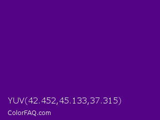 YUV 42.452,45.133,37.315 Color is a dark purple color and the nearest color is Pigment Indigo #4b0082. Hex code #550386 and RGB value is rgb(85,3,134). In RGB color space, this color is composed of 33% red, 1% green, 53% blue, In CMYK color space, this color is composed of 37% cyan, 98% magenta, 0% yellow , 47% black , In HSL color space, this color has a hue angle of 278° , 96% saturation and 27% lightness.