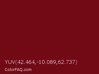 YUV 42.464,-10.089,62.737 Color is a dark red color and the nearest color is Venetian Red #72010f. Hex code #720a16 and RGB value is rgb(114,10,22). In RGB color space, this color is composed of 45% red, 4% green, 9% blue, In CMYK color space, this color is composed of 0% cyan, 91% magenta, 81% yellow , 55% black , In HSL color space, this color has a hue angle of 353° , 84% saturation and 24% lightness.
