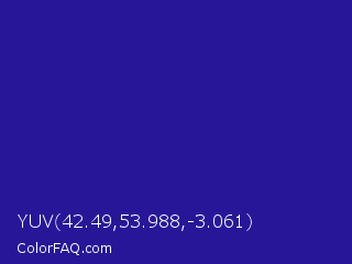 YUV 42.49,53.988,-3.061 Color is a normal indigo color and the nearest color is Blue Gem #2c0e8c. Hex code #271798 and RGB value is rgb(39,23,152). In RGB color space, this color is composed of 15% red, 9% green, 60% blue, In CMYK color space, this color is composed of 74% cyan, 85% magenta, 0% yellow , 40% black , In HSL color space, this color has a hue angle of 247° , 74% saturation and 34% lightness.