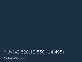 YUV 42.528,12.558,-14.495 Color is a very dark blue color and the nearest color is Big Stone #162a40. Hex code #1a2e44 and RGB value is rgb(26,46,68). In RGB color space, this color is composed of 10% red, 18% green, 27% blue, In CMYK color space, this color is composed of 62% cyan, 32% magenta, 0% yellow , 73% black , In HSL color space, this color has a hue angle of 211° , 45% saturation and 18% lightness.