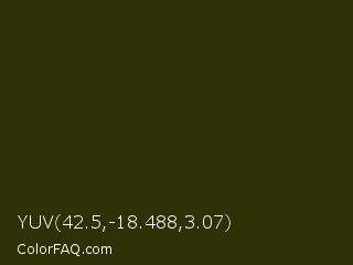 YUV 42.5,-18.488,3.07 Color is a very dark yellow color and the nearest color is Turtle Green #2a380b. Hex code #2e3005 and RGB value is rgb(46,48,5). In RGB color space, this color is composed of 18% red, 19% green, 2% blue, In CMYK color space, this color is composed of 4% cyan, 0% magenta, 90% yellow , 81% black , In HSL color space, this color has a hue angle of 63° , 81% saturation and 10% lightness.
