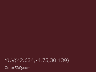 YUV 42.634,-4.75,30.139 Color is a very dark red color and the nearest color is Cocoa Bean #481c1c. Hex code #4d1b21 and RGB value is rgb(77,27,33). In RGB color space, this color is composed of 30% red, 11% green, 13% blue, In CMYK color space, this color is composed of 0% cyan, 65% magenta, 57% yellow , 70% black , In HSL color space, this color has a hue angle of 353° , 48% saturation and 20% lightness.