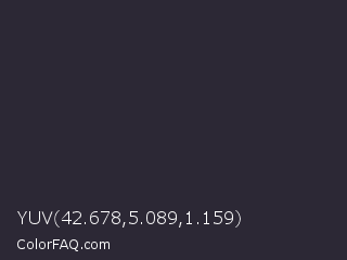 YUV 42.678,5.089,1.159 Color is a very dark indigo color and the nearest color is Charade #292937. Hex code #2c2835 and RGB value is rgb(44,40,53). In RGB color space, this color is composed of 17% red, 16% green, 21% blue, In CMYK color space, this color is composed of 17% cyan, 25% magenta, 0% yellow , 79% black , In HSL color space, this color has a hue angle of 258° , 14% saturation and 18% lightness.