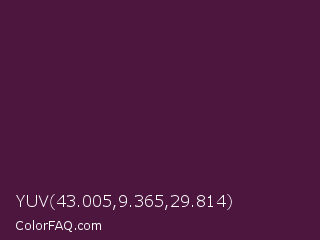 YUV 43.005,9.365,29.814 Color is a very dark magenta color and the nearest color is Loulou #460b41. Hex code #4d163e and RGB value is rgb(77,22,62). In RGB color space, this color is composed of 30% red, 9% green, 24% blue, In CMYK color space, this color is composed of 0% cyan, 71% magenta, 19% yellow , 70% black , In HSL color space, this color has a hue angle of 316° , 56% saturation and 19% lightness.