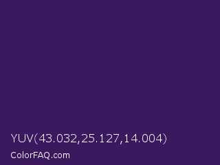 YUV 43.032,25.127,14.004 Color is a dark violet color and the nearest color is Scarlet Gum #431560. Hex code #3b195e and RGB value is rgb(59,25,94). In RGB color space, this color is composed of 23% red, 10% green, 37% blue, In CMYK color space, this color is composed of 37% cyan, 73% magenta, 0% yellow , 63% black , In HSL color space, this color has a hue angle of 270° , 58% saturation and 23% lightness.