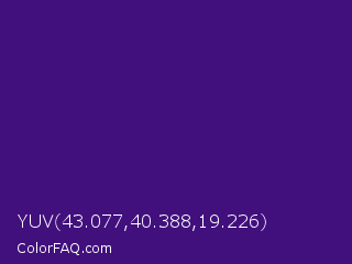 YUV 43.077,40.388,19.226 Color is a dark violet color and the nearest color is Windsor #3c0878. Hex code #41107d and RGB value is rgb(65,16,125). In RGB color space, this color is composed of 25% red, 6% green, 49% blue, In CMYK color space, this color is composed of 48% cyan, 87% magenta, 0% yellow , 51% black , In HSL color space, this color has a hue angle of 267° , 77% saturation and 28% lightness.
