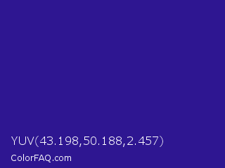 YUV 43.198,50.188,2.457 Color is a normal indigo color and the nearest color is Blue Gem #2c0e8c. Hex code #2e1691 and RGB value is rgb(46,22,145). In RGB color space, this color is composed of 18% red, 9% green, 57% blue, In CMYK color space, this color is composed of 68% cyan, 85% magenta, 0% yellow , 43% black , In HSL color space, this color has a hue angle of 252° , 74% saturation and 33% lightness.