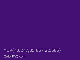 YUV 43.247,35.867,22.585 Color is a dark purple color and the nearest color is Windsor #3c0878. Hex code #451074 and RGB value is rgb(69,16,116). In RGB color space, this color is composed of 27% red, 6% green, 45% blue, In CMYK color space, this color is composed of 41% cyan, 86% magenta, 0% yellow , 55% black , In HSL color space, this color has a hue angle of 272° , 76% saturation and 26% lightness.