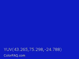 YUV 43.265,75.298,-24.788 Color is a normal blue color and the nearest color is Blue Pantone #0018a8. Hex code #0f1cc4 and RGB value is rgb(15,28,196). In RGB color space, this color is composed of 6% red, 11% green, 77% blue, In CMYK color space, this color is composed of 92% cyan, 86% magenta, 0% yellow , 23% black , In HSL color space, this color has a hue angle of 236° , 86% saturation and 41% lightness.