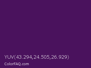 YUV 43.294,24.505,26.929 Color is a very dark purple color and the nearest color is Scarlet Gum #431560. Hex code #4a125d and RGB value is rgb(74,18,93). In RGB color space, this color is composed of 29% red, 7% green, 36% blue, In CMYK color space, this color is composed of 20% cyan, 81% magenta, 0% yellow , 64% black , In HSL color space, this color has a hue angle of 285° , 68% saturation and 22% lightness.
