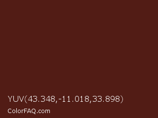YUV 43.348,-11.018,33.898 Color is a very dark red color and the nearest color is Cocoa Bean #481c1c. Hex code #521c15 and RGB value is rgb(82,28,21). In RGB color space, this color is composed of 32% red, 11% green, 8% blue, In CMYK color space, this color is composed of 0% cyan, 66% magenta, 74% yellow , 68% black , In HSL color space, this color has a hue angle of 7° , 59% saturation and 20% lightness.