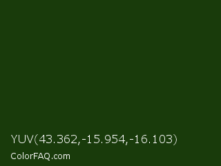 YUV 43.362,-15.954,-16.103 Color is a very dark green color and the nearest color is Palm Leaf #19330e. Hex code #193b0b and RGB value is rgb(25,59,11). In RGB color space, this color is composed of 10% red, 23% green, 4% blue, In CMYK color space, this color is composed of 58% cyan, 0% magenta, 81% yellow , 77% black , In HSL color space, this color has a hue angle of 103° , 69% saturation and 14% lightness.