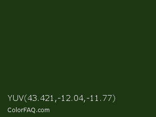 YUV 43.421,-12.04,-11.77 Color is a very dark green color and the nearest color is Mallard #233418. Hex code #1e3713 and RGB value is rgb(30,55,19). In RGB color space, this color is composed of 12% red, 22% green, 7% blue, In CMYK color space, this color is composed of 45% cyan, 0% magenta, 65% yellow , 78% black , In HSL color space, this color has a hue angle of 102° , 49% saturation and 15% lightness.