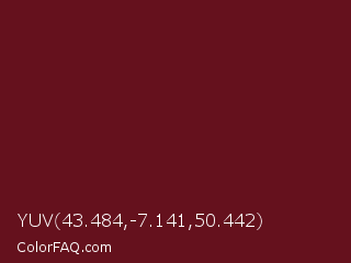YUV 43.484,-7.141,50.442 Color is a dark red color and the nearest color is Cherrywood #651a14. Hex code #65111d and RGB value is rgb(101,17,29). In RGB color space, this color is composed of 40% red, 7% green, 11% blue, In CMYK color space, this color is composed of 0% cyan, 83% magenta, 71% yellow , 60% black , In HSL color space, this color has a hue angle of 351° , 71% saturation and 23% lightness.
