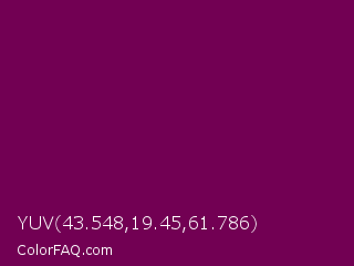 YUV 43.548,19.45,61.786 Color is a very dark magenta color and the nearest color is Pompadour #660045. Hex code #720053 and RGB value is rgb(114,-0,83). In RGB color space, this color is composed of 45% red, 0% green, 33% blue, In CMYK color space, this color is composed of 0% cyan, 100% magenta, 27% yellow , 55% black , In HSL color space, this color has a hue angle of 316° , 100% saturation and 22% lightness.