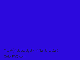 YUV 43.633,87.442,0.322 Color is a normal indigo color and the nearest color is Interdimensional Blue #360ccc. Hex code #2c09dd and RGB value is rgb(44,9,221). In RGB color space, this color is composed of 17% red, 4% green, 87% blue, In CMYK color space, this color is composed of 80% cyan, 96% magenta, 0% yellow , 13% black , In HSL color space, this color has a hue angle of 250° , 92% saturation and 45% lightness.