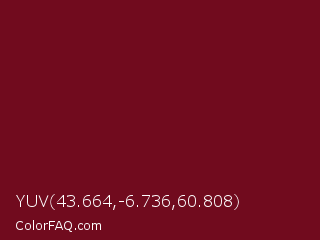 YUV 43.664,-6.736,60.808 Color is a dark red color and the nearest color is UP Maroon #7b1113. Hex code #710b1e and RGB value is rgb(113,11,30). In RGB color space, this color is composed of 44% red, 4% green, 12% blue, In CMYK color space, this color is composed of 0% cyan, 90% magenta, 73% yellow , 56% black , In HSL color space, this color has a hue angle of 349° , 82% saturation and 24% lightness.