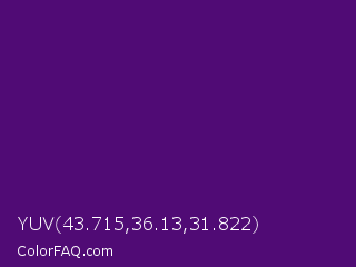 YUV 43.715,36.13,31.822 Color is a dark purple color and the nearest color is Honey Flower #4f1c70. Hex code #500b75 and RGB value is rgb(80,11,117). In RGB color space, this color is composed of 31% red, 4% green, 46% blue, In CMYK color space, this color is composed of 32% cyan, 91% magenta, 0% yellow , 54% black , In HSL color space, this color has a hue angle of 279° , 83% saturation and 25% lightness.