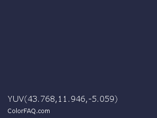 YUV 43.768,11.946,-5.059 Color is a very dark blue color and the nearest color is Ebony Clay #26283b. Hex code #262a44 and RGB value is rgb(38,42,68). In RGB color space, this color is composed of 15% red, 16% green, 27% blue, In CMYK color space, this color is composed of 44% cyan, 38% magenta, 0% yellow , 73% black , In HSL color space, this color has a hue angle of 232° , 28% saturation and 21% lightness.