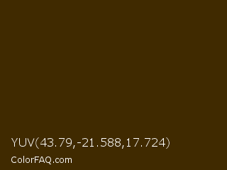 YUV 43.79,-21.588,17.724 Color is a very dark orange color and the nearest color is Cola #3f2500. Hex code #402a00 and RGB value is rgb(64,42,-0). In RGB color space, this color is composed of 25% red, 16% green, 0% blue, In CMYK color space, this color is composed of 0% cyan, 34% magenta, 100% yellow , 75% black , In HSL color space, this color has a hue angle of 39° , 100% saturation and 13% lightness.