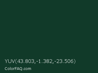 YUV 43.803,-1.382,-23.506 Color is a very dark green color and the nearest color is Phthalo Green #123524. Hex code #113a29 and RGB value is rgb(17,58,41). In RGB color space, this color is composed of 7% red, 23% green, 16% blue, In CMYK color space, this color is composed of 71% cyan, 0% magenta, 29% yellow , 77% black , In HSL color space, this color has a hue angle of 155° , 55% saturation and 15% lightness.