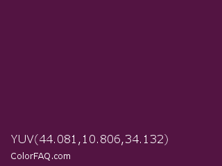 YUV 44.081,10.806,34.132 Color is a very dark magenta color and the nearest color is Loulou #460b41. Hex code #531442 and RGB value is rgb(83,20,66). In RGB color space, this color is composed of 33% red, 8% green, 26% blue, In CMYK color space, this color is composed of 0% cyan, 76% magenta, 20% yellow , 67% black , In HSL color space, this color has a hue angle of 316° , 61% saturation and 20% lightness.