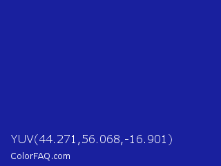 YUV 44.271,56.068,-16.901 Color is a normal blue color and the nearest color is Torea Bay #0f2d9e. Hex code #19209e and RGB value is rgb(25,32,158). In RGB color space, this color is composed of 10% red, 13% green, 62% blue, In CMYK color space, this color is composed of 84% cyan, 80% magenta, 0% yellow , 38% black , In HSL color space, this color has a hue angle of 237° , 73% saturation and 36% lightness.