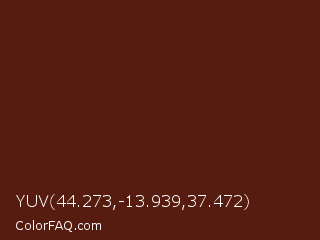 YUV 44.273,-13.939,37.472 Color is a very dark red color and the nearest color is Redwood #5d1e0f. Hex code #571c10 and RGB value is rgb(87,28,16). In RGB color space, this color is composed of 34% red, 11% green, 6% blue, In CMYK color space, this color is composed of 0% cyan, 68% magenta, 82% yellow , 66% black , In HSL color space, this color has a hue angle of 10° , 69% saturation and 20% lightness.
