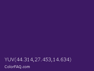 YUV 44.314,27.453,14.634 Color is a dark violet color and the nearest color is Scarlet Gum #431560. Hex code #3d1964 and RGB value is rgb(61,25,100). In RGB color space, this color is composed of 24% red, 10% green, 39% blue, In CMYK color space, this color is composed of 39% cyan, 75% magenta, 0% yellow , 61% black , In HSL color space, this color has a hue angle of 269° , 60% saturation and 25% lightness.