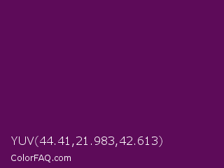 YUV 44.41,21.983,42.613 Color is a very dark magenta color and the nearest color is Clairvoyant #480656. Hex code #5d0b59 and RGB value is rgb(93,11,89). In RGB color space, this color is composed of 36% red, 4% green, 35% blue, In CMYK color space, this color is composed of 0% cyan, 88% magenta, 4% yellow , 64% black , In HSL color space, this color has a hue angle of 303° , 79% saturation and 20% lightness.