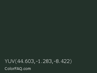 YUV 44.603,-1.283,-8.422 Color is a very dark green color and the nearest color is Black Leather Jacket #253529. Hex code #23322a and RGB value is rgb(35,50,42). In RGB color space, this color is composed of 14% red, 20% green, 16% blue, In CMYK color space, this color is composed of 30% cyan, 0% magenta, 16% yellow , 80% black , In HSL color space, this color has a hue angle of 148° , 18% saturation and 17% lightness.