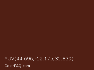YUV 44.696,-12.175,31.839 Color is a very dark red color and the nearest color is Brown Derby #492615. Hex code #511f14 and RGB value is rgb(81,31,20). In RGB color space, this color is composed of 32% red, 12% green, 8% blue, In CMYK color space, this color is composed of 0% cyan, 62% magenta, 75% yellow , 68% black , In HSL color space, this color has a hue angle of 11° , 60% saturation and 20% lightness.